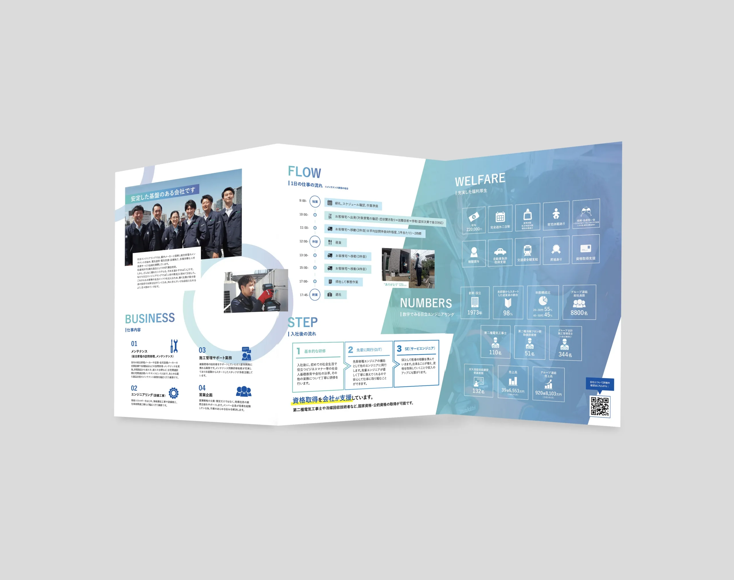 家電製品・住宅設備・空調衛生設備の施工・メンテナンス、そして電気設備工事を手がける企業の高校生向け採用パンフレットを企画・制作。